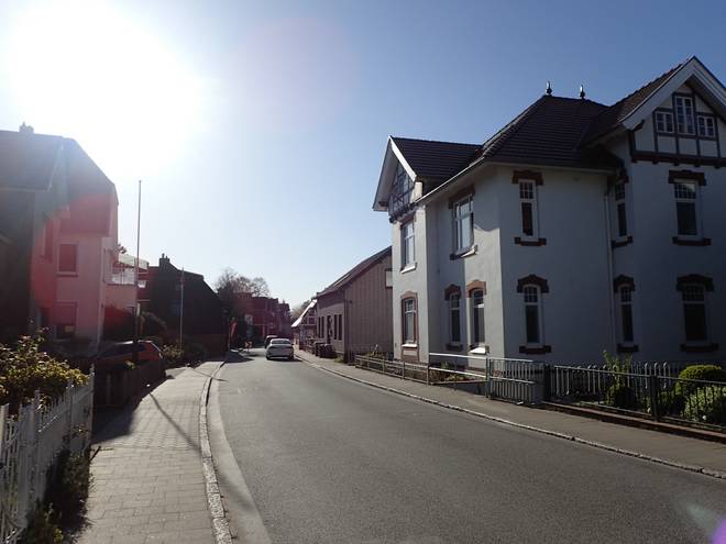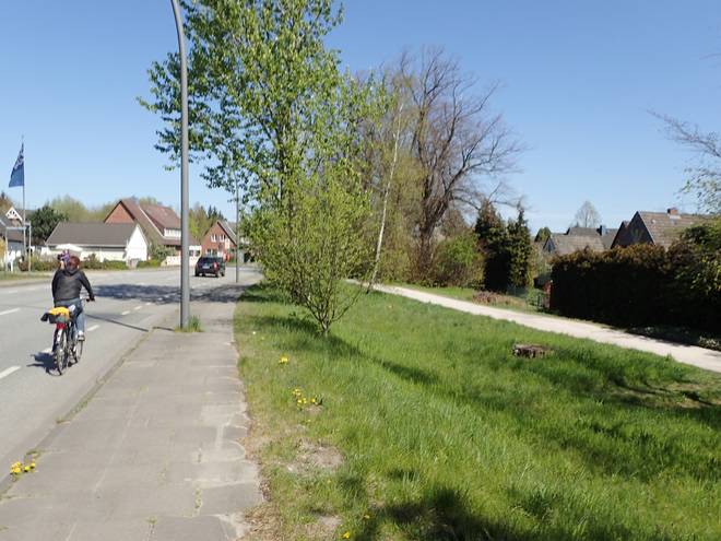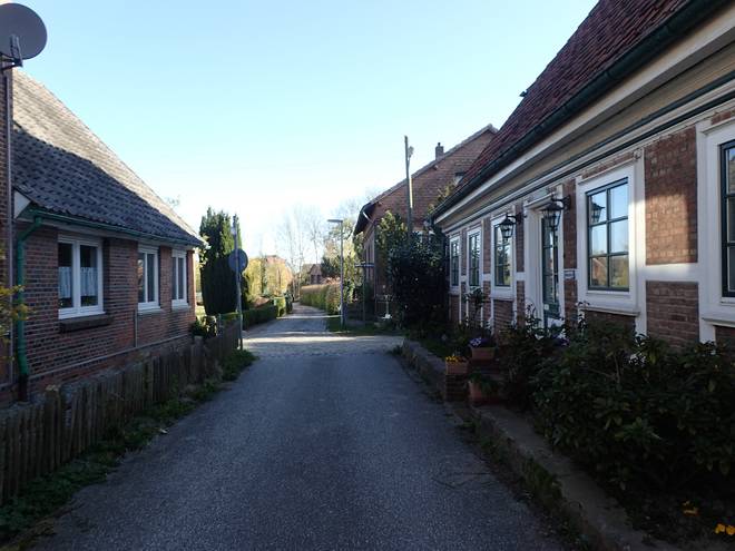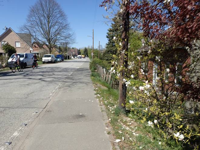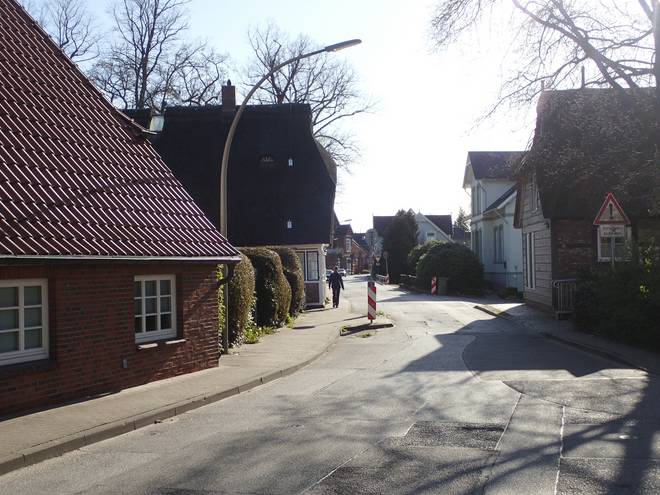 Altengammer Hausdeich Ich hatte nicht gedacht, daß hier überall Häuser stehen würden. Auf der Karte sah es weit weniger bebaut aus. Da am Start kein Klo war, wurde es allmählich dringend. |