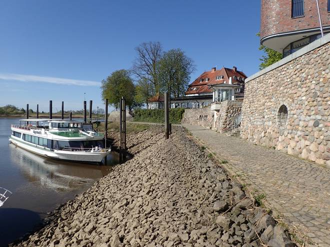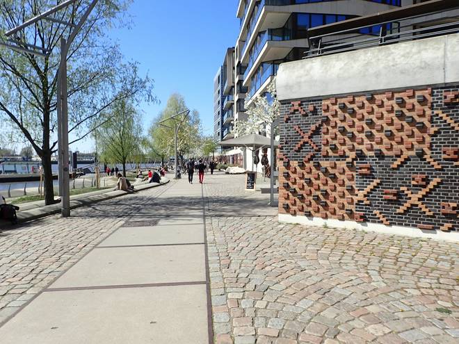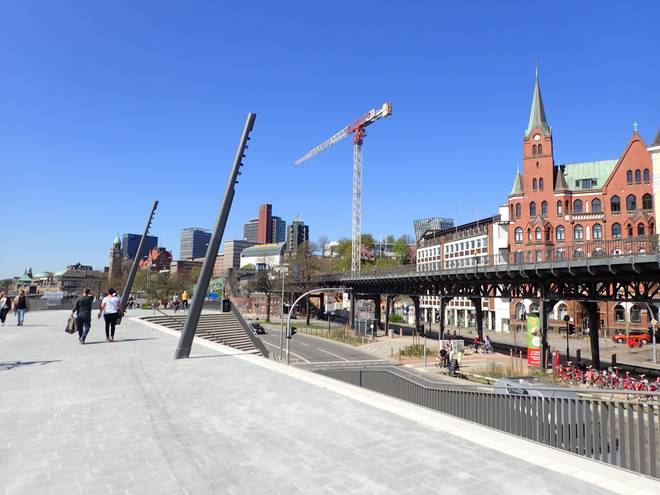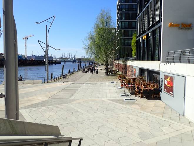 Elbpromenade Baumwall Kurz vor dem Finale dann die teuersten und sinnlosesten Deich-Meter der Strecke. 625 Meter, 136 Millionen Euro, 2,45 Meter höher als jede bisher da gewesene Flut. Und rechts und rechts neben der Promenade kann das Wasser ungehindert in die Stadt laufen. |