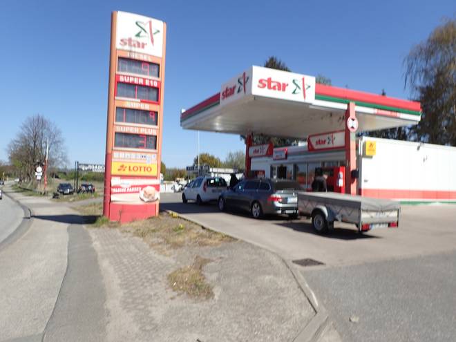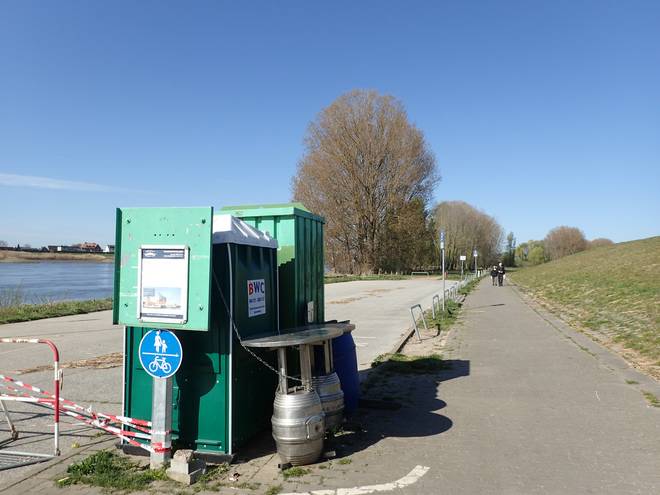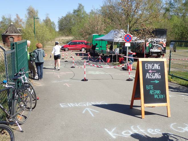 Kaltehofe Hauptdeich Die Wasserkunst war auch Opfer der Corona-Offnungs-Verbote-Welle geworden. Der Parkplatz wurde derweil für einen Getränke-Verkauf genutzt. Natürlich mit dem zu der Zeit üblichen Abstand-Markierungs-Irrsinn. Nun hatte ich ausreichend zu trinken dabei. Wie durstige hätte ich sein müssen, ehe ich mir sieben Kilometer vor dem Ziel diesen Wahnsinn angetan hätte? |