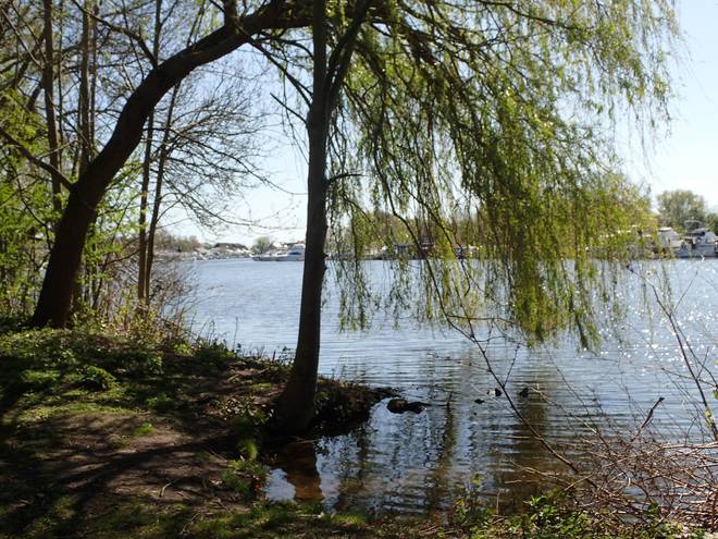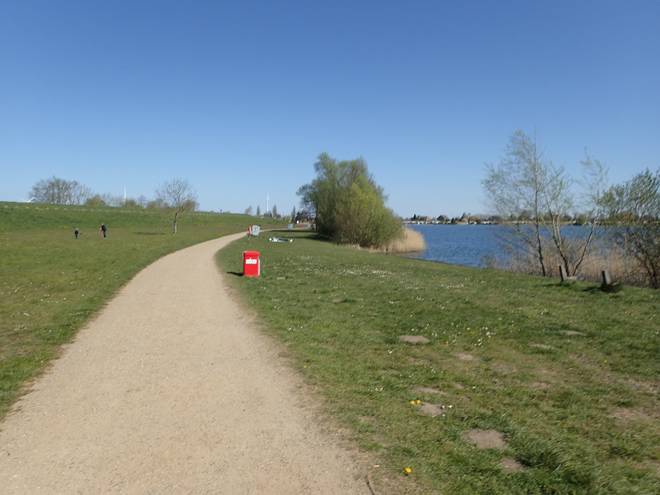Am Hohendeicher See 2:24:11 Stunden hatte ich hier bei der Strecken-Hälfte auf meiner Uhr. Bisher liefen die Kilometer der bei Komoot geplante Strecke ziemlich parallel zu den Zahlen auf meiner GPS-Uhr. |