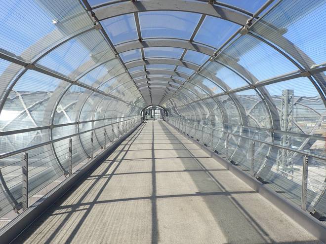 Skywalk Bahnhof Elbbrücken Der Skywalk verbindet die S-Bahnstation mit der U-Bahn-Station. Er ist 65 Meter lang. |