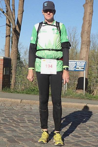 Odemanns Heck Marathon ohne Gepäckabgabe und Verpflegungsstände ist schwierig. Man geht morgens bei 2°C aus dem Haus, fängt bei 7°C an zu laufen und dann werden es allmählich 17°C, bis man im Ziel ist. Ein logistischer Kraftakt. Und ein recht voller Rucksack. |