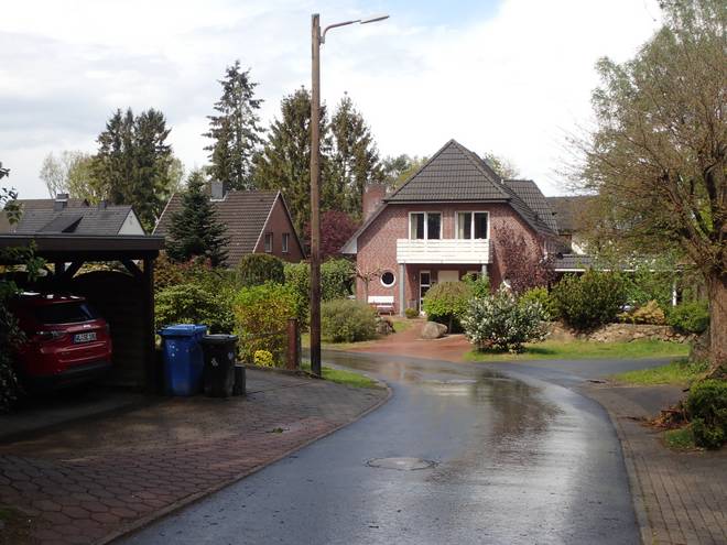 Steinbecker Straße Buchholz Nun begann der erste Regen. 13.17 Uhr war eigentlich ein wenig zu früh, aber der Regen kam von Süden und ich wäre ohne die Start-Verspätung schon viel weiter nördlich gewesen. |
