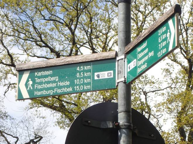 Alter Postweg Stuvenwald So ein Schild führte mich im Büsenbachtal zwar schon in die Irre, aber Richtung Hamburg-Fischbek konnte so sehr falsch nicht sein. Da ich wegen des Umwegs bei Kilometer 5 nicht mehr genau wußte, wie weit es bis ins Ziel war, wußte ich auch nicht, wo die Streckenhälfte war. Aber Kilometer 23 schien mir ein guter Tip. 2:50 Stunden. |