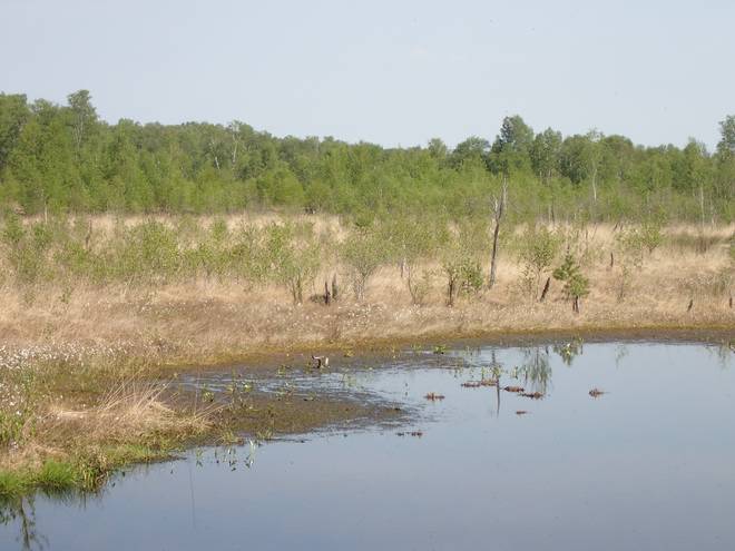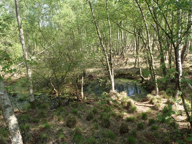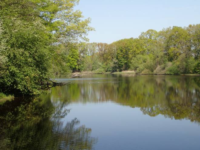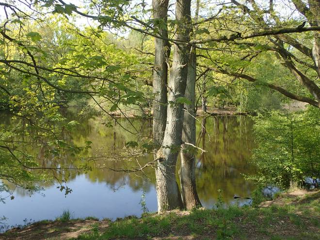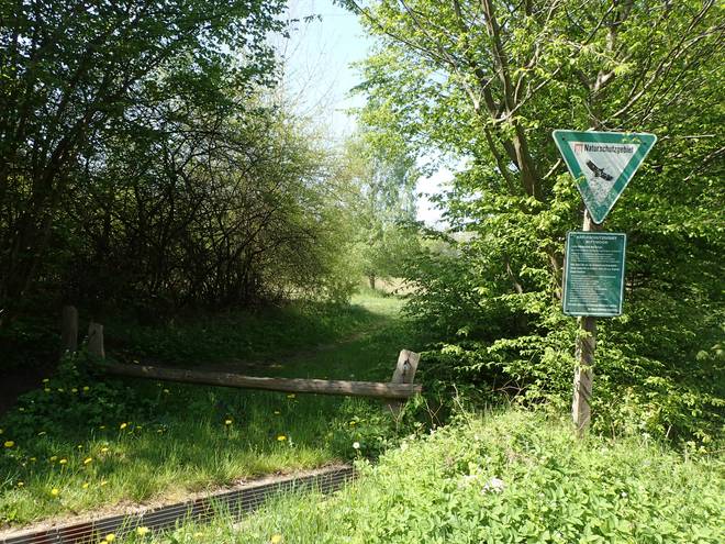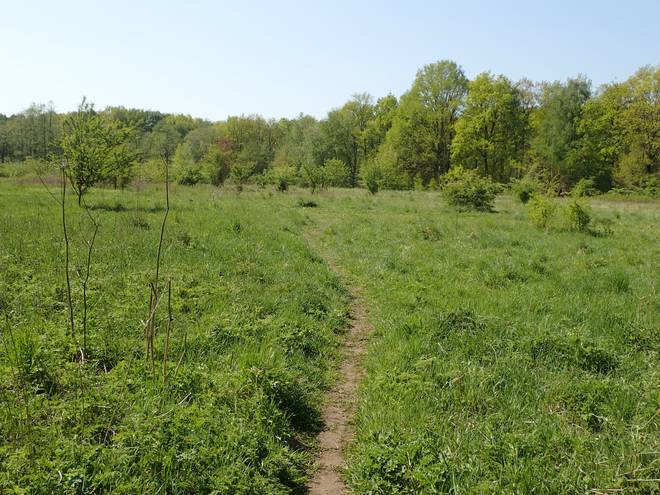 Richtung Kupferteich Das Naturschutzgebiet hatte ich nun verlasse und steuerte direkt auf den Kupferteich zu, der vorne hinter den Bäumen versteckt war. |