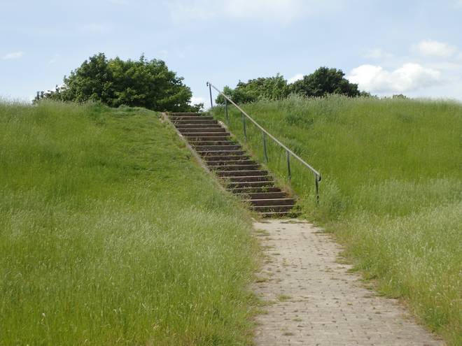 Elbewanderweg Wedel Bisher war die Strecke sehr flach gewesen (quasi zweimal über einen Deich, sonst null Höhenmeter), aber ab hier wurde es hügelig. Zunächst die Treppen rauf. |