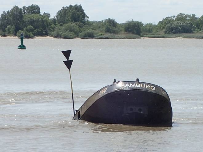 Falkensteiner Ufer Dort liegt auch das Wrack des Binnenschiffs "MS Uwe", der hier 1975 nach einer Kollision unterging. Der vordere Teil wurde 1976 verschrottet, der hintere Teil erwies sich als zu schwer für eine Bergung. Na, hoffentlich sinkt nicht irgendwann mal ein wirklich schweres Schiff in der Elbe. |