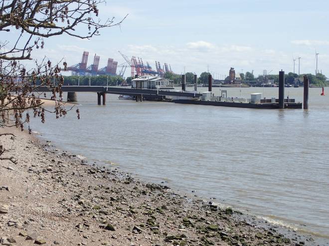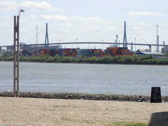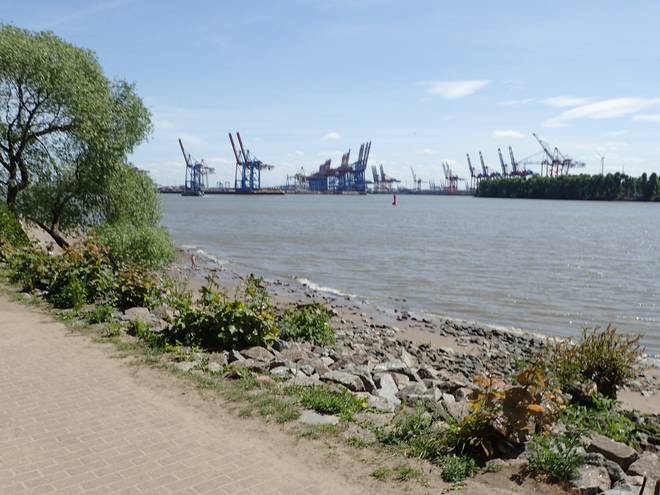 Hans-Leip-Ufer Auf der anderen Elbe-Seite blickte man hier auf die Kräne des Containerterminals von Waltershof und etwas weiter hinten die Köhlbrandbrücke. |