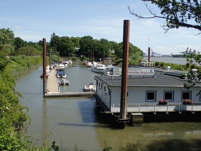Jachthafen Teufelsbrück Teufelsbrück Ich trank den letzten halben Liter aus dem Rucksack. Der war nun schön leicht. Aber für die letzten vermutlich noch 8,8 Kilometer mußte das reichen. Auf ein weiteres Kauf-Getränk hatte ich wenig Hoffnung. |