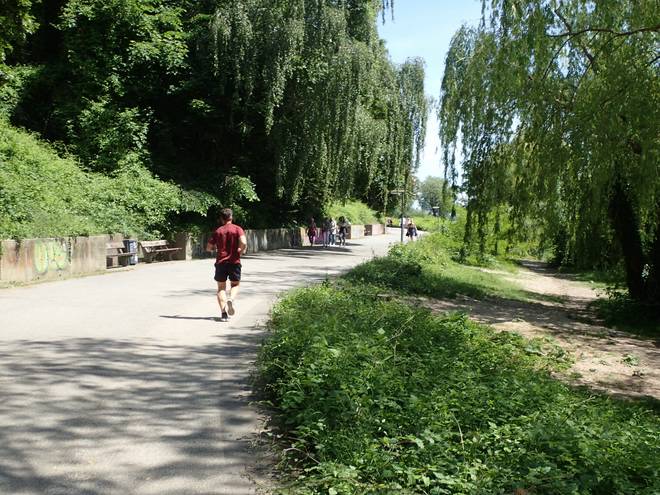 Ahja... mit 3:1 bevorzugten es die Radfahrer, den Fußweg zu benutzen. Warum ich auf dem Rasen laufe? Es waren nicht die ersten Radfahrer, die hier den Fußweg bevorzugten. Und da immer wieder auch mal ein Radfahrer den Radweg nutzte, lief ich wieder gleich neben den Wegen. Ich habe die Rad-Idioten nicht unkenntlich gemacht, weil ich sie vor Strafverfolgung retten möchte, sondern weil ich deren Arschloch-Fratzen nicht auf meinen Bildern sehen möchte. |