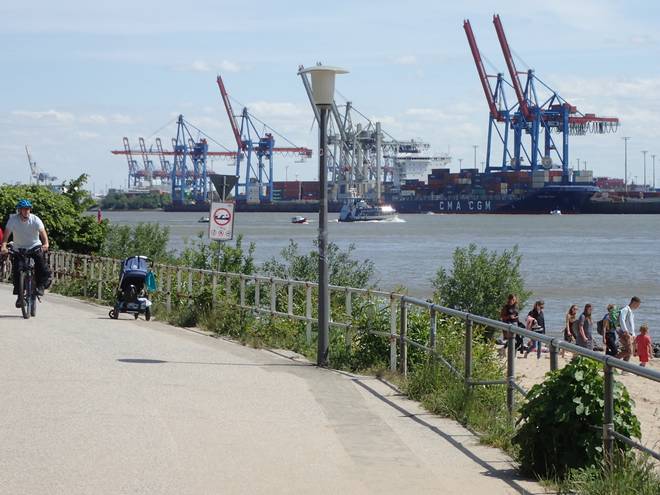 Övelgönne Blick über den Strand auf das Feuerschiff "Elbe 3", die Elne und auf den Containerterminal Burchardkai. Hier führt der Neue Elbtunnel mit drei der vier Röhren unter Strand und Wasser hindurch. Wer 28 Meter tief buddelt, stößt auf Beton. Die vierte Röhre liegt etwas weiter westlich. |