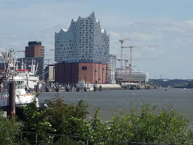 St. Pauli Fischmarkt Blick über die Norderelbe auf die Elbphilharmonie. |