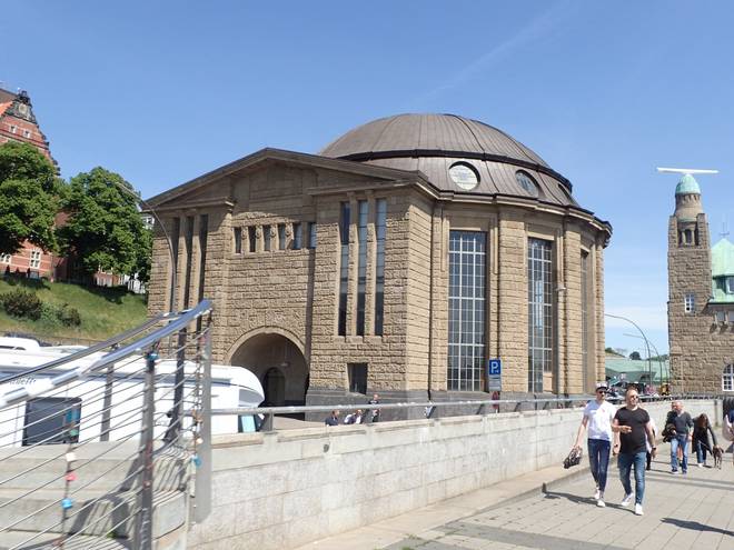Bei den St. Pauli Landungsbrücken Links der Alte Elbtunnel. |