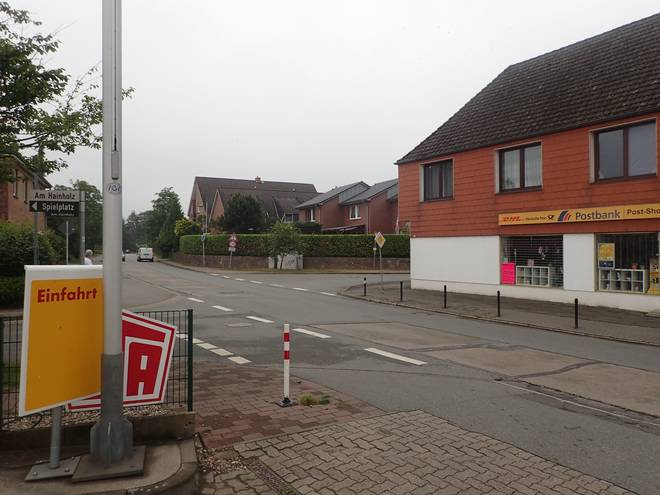 Petersweg Großensee Bis zur Tankstelle in Witzhave waren es noch 6,3 Kilometer. Falls ich mich nicht verlief. Bis hierhin hatte ich mir schon 1,7 Extra-Kilometer aufgeladen. |