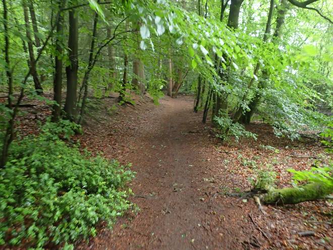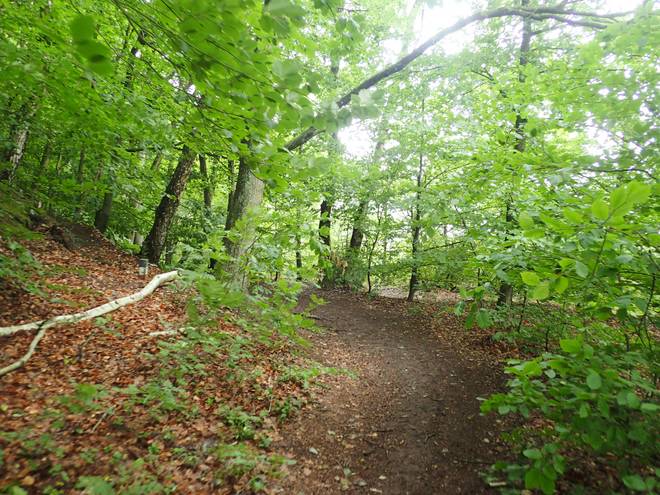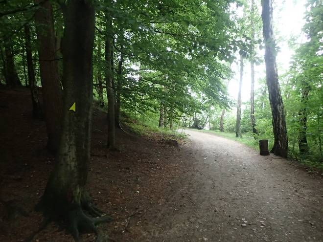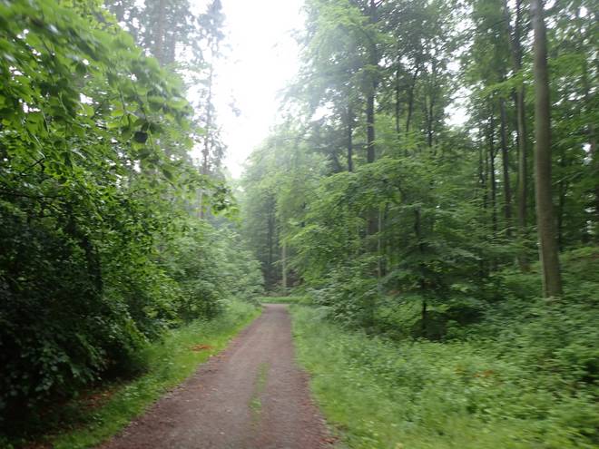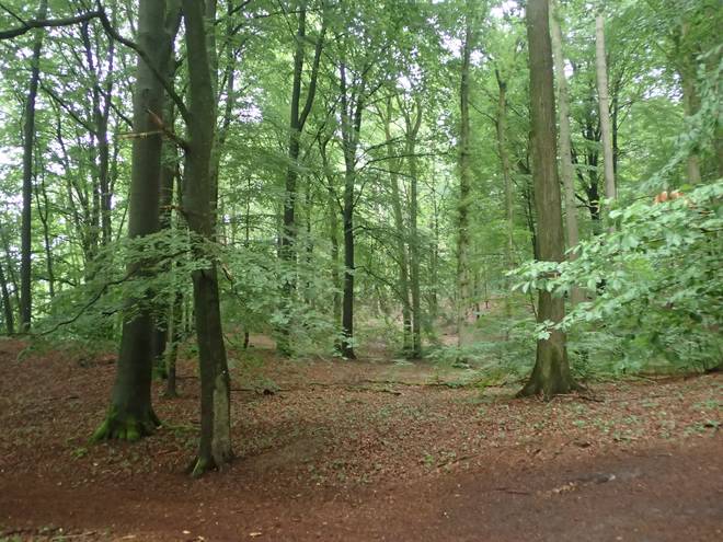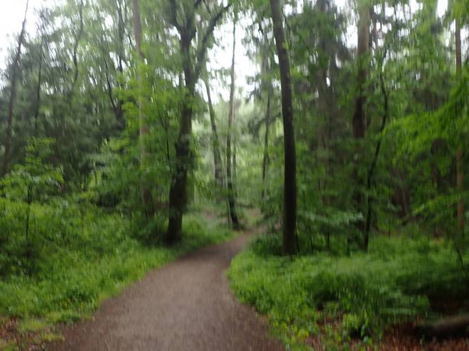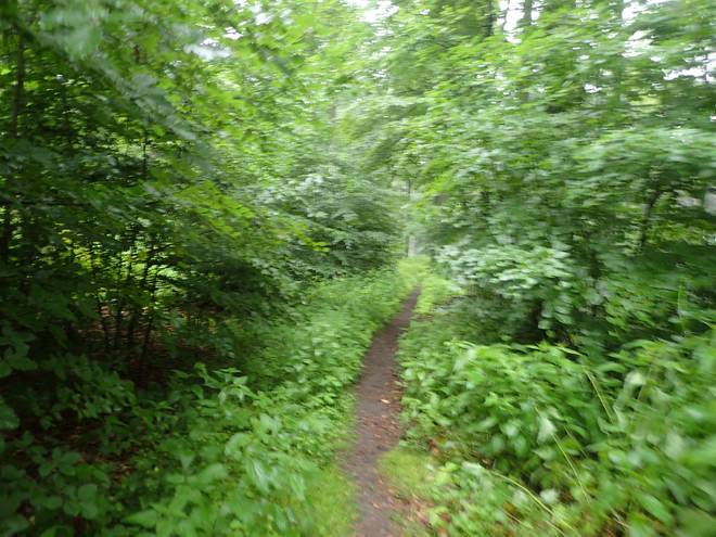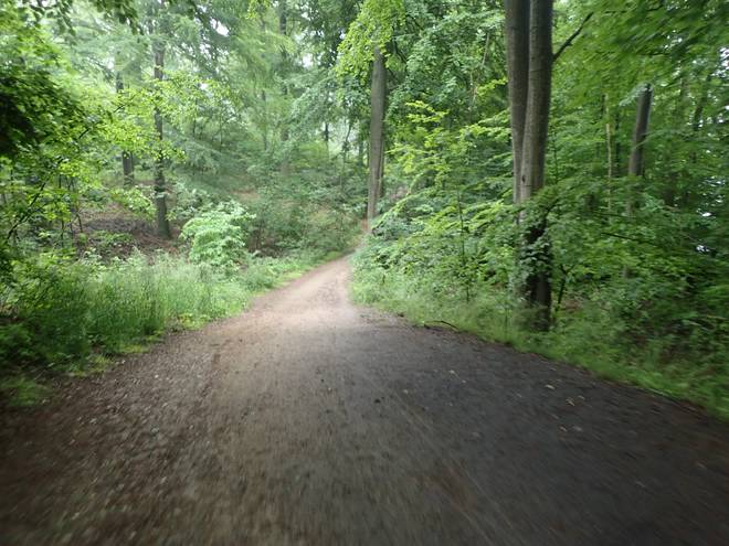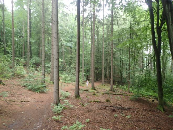 Am Mönchsteich Meist schmale Wege, teils matschig, recht hügelig, ein paar umgestürzte Bäume und oft sehr niedrige Äste, die mir gegen den Kopf knallten, weil ich gerade eines oder zwei der vorgenannten Probleme im Blick haben mußte. |