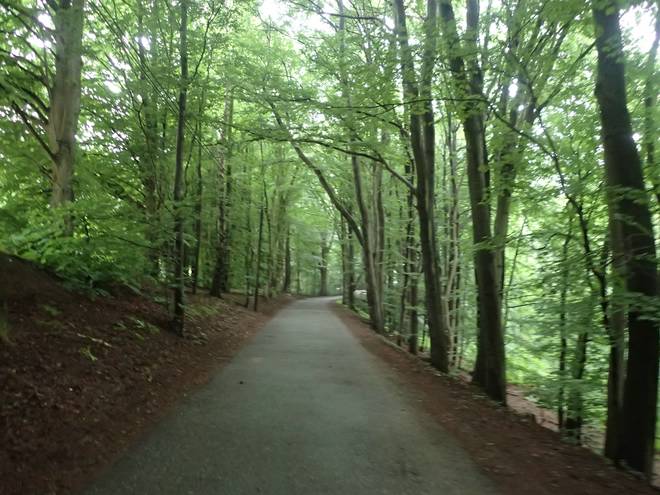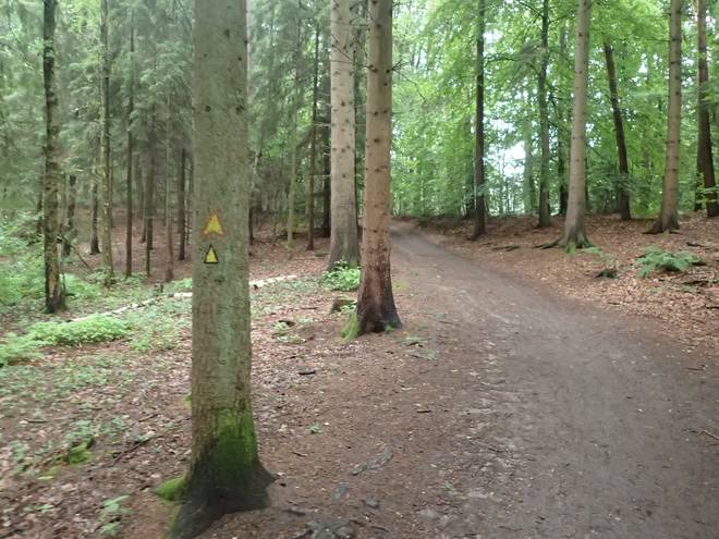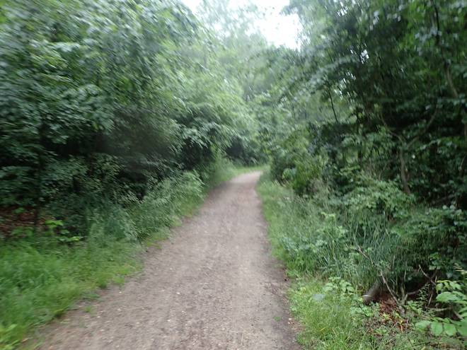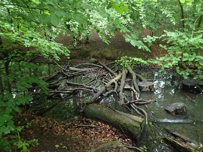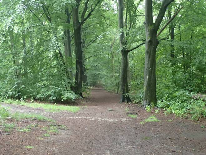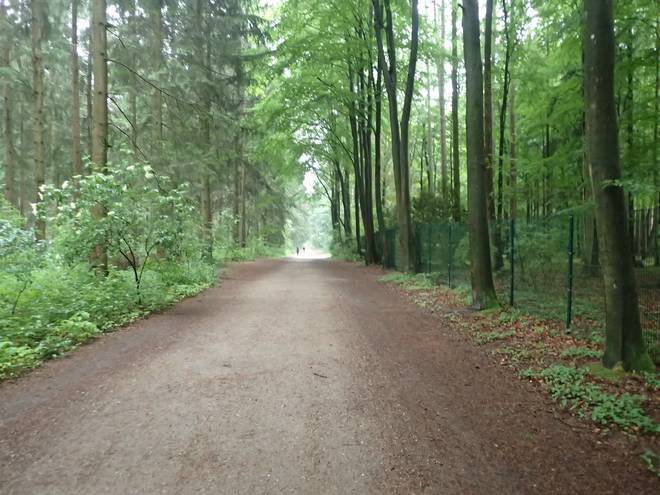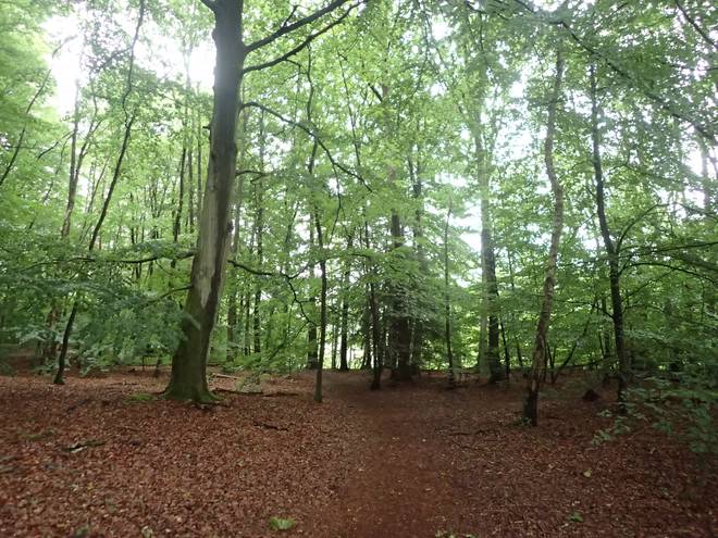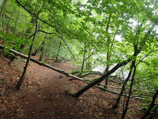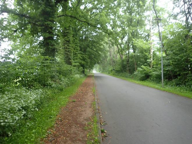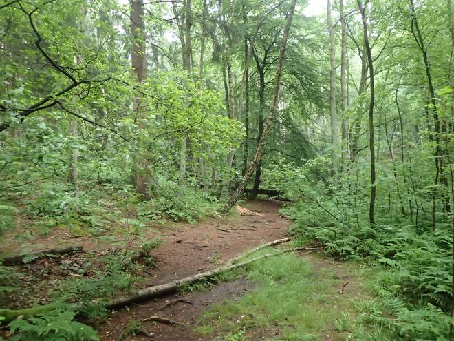 Am Mönchsteich Meist schmale Wege, teils matschig, recht hügelig, ein paar umgestürzte Bäume und oft sehr niedrige Äste, die mir gegen den Kopf knallten, weil ich gerade eines oder zwei der vorgenannten Probleme im Blick haben mußte. |