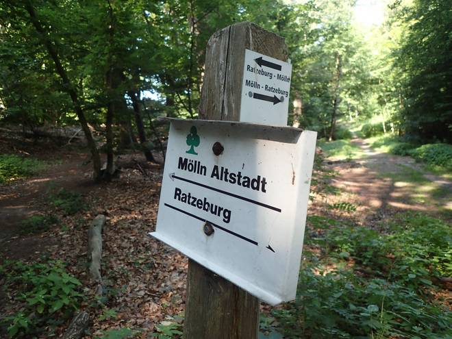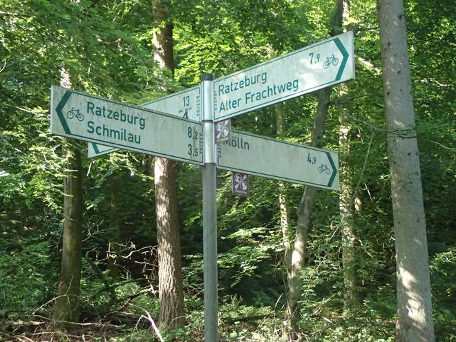 Fredeburg Ruheforst (Richtung Mölln) 9.48 Uhr Aha... nach rechts und hinten ging es zurück nach Ratzeburg, nach links und geradeaus nach Mölln. Vermutlich. Naja... ein wenig irrte ich noch herum, aber recht bald fand ich den Weg nach Mölln rein. 12,8 Kilometer hatte ich nun geschafft. 13,2 hatte ich auf meiner Uhr. Zweimal hatte ich mich ja schon verlaufen. |