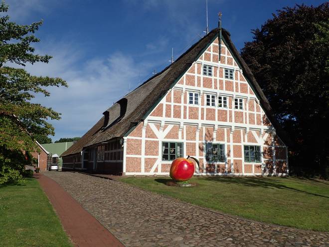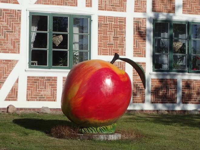 Huttfleth Grünendeich Der Riesen-Apfel steht vor einem Haus genau gegenüber eines Großhandels Obst und Gemüse. |