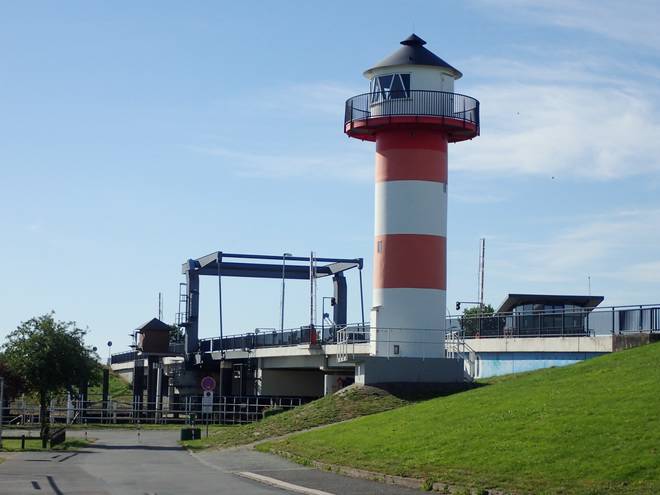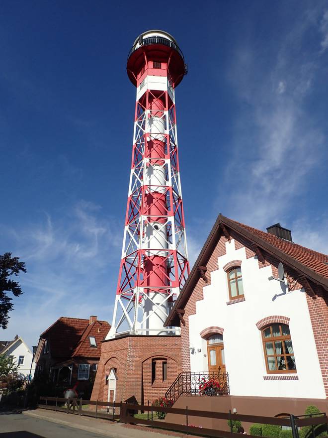 Kirchenstieg Grünendeich 794 Meter sind es von diesem Leuchtturm zum Wasser. Ein ungewöhnlicher Ort für einen Leuchtturm. |