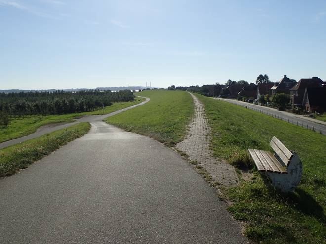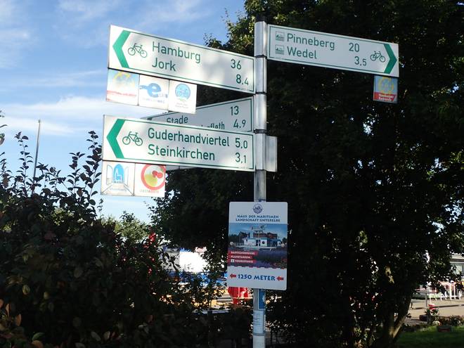 Elbdeich Grünendeich Stade war für mich schon 18 Kilometer her, bis nach Jork würden es etwas mehr als 10 Kilometer werden. Die Distanz bis nach Steinkirchen und ins Guderhandviertel passte aber. Nach Wedel sind es wirklich nur 3,5 Kilometer, davon aber 2,4 Kilometer Elbe. Man sollte schon die Fähre nutzen (oder etwas ähnlich schwimmendes). |