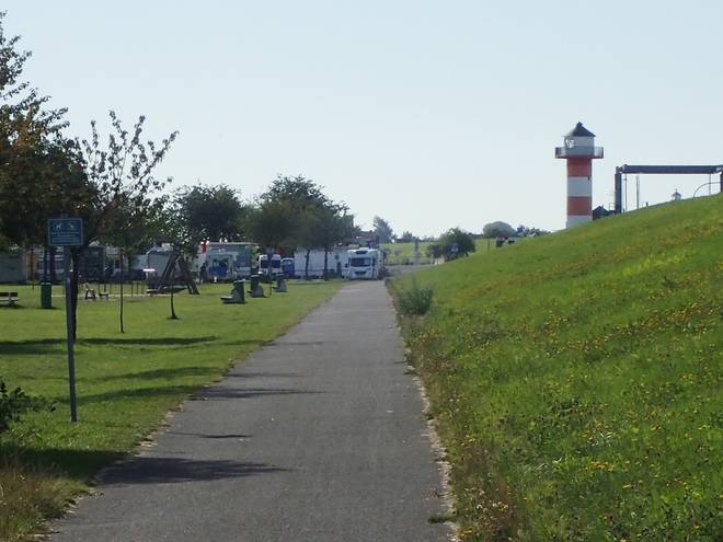 Elbdeich Grünendeich Links der Wohnmobilstellplatz am Lühe-Anleger und rechts das Unterfeuer Lühe. |
