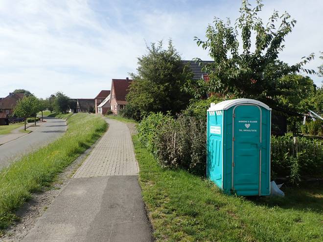Hohenfelde Mittelnkirchen Kurz danach eine kombinierte Pinkel- und Trinkpause. Das bot sich an. Im Dixie waren es sicherlich 60°C und auch sonst wurde es immer heißer. Aber nach dem Trinken wurde mein Rucksack spürbar leichter. |