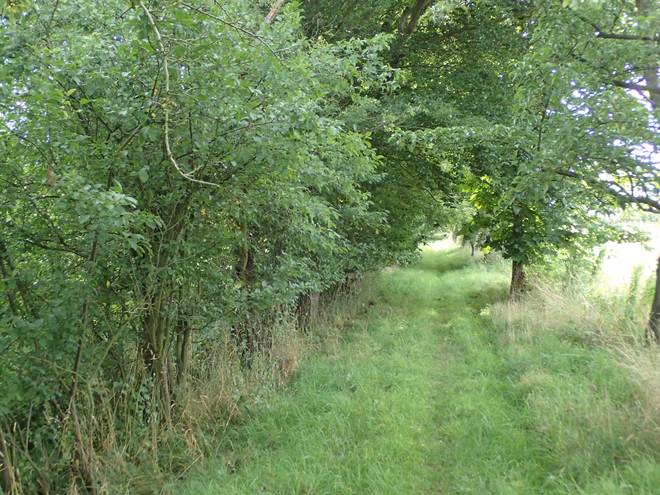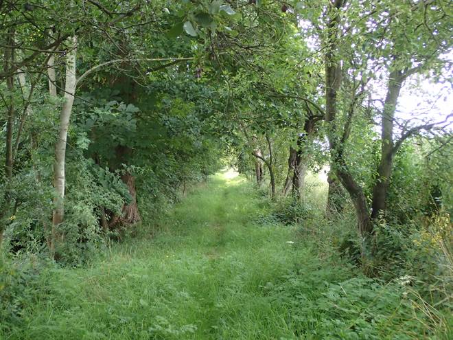 Muddweg Aber es ging hier tatsächlich immer weiter. Und schon war es. Auch schön schattig. Auf dem sehr unebenen Gras schaltete ich dennoch erstmals von Laufen auf Wandern um. |