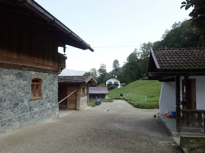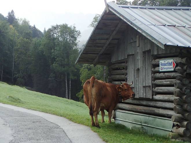 Richtung Hintergraseck Freilaufende Kühe... hmmm. Mit freilaufenden Hunden kannte ich mich aus. Weniger schöne Erfahrungen. Kühe waren definitiv größer und schwerer. |