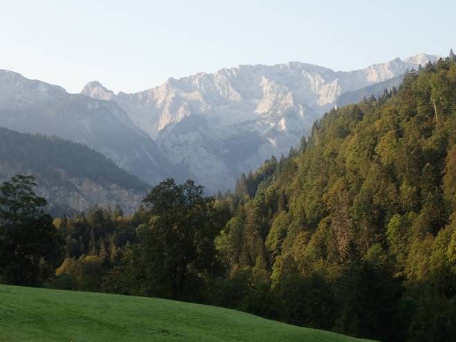 Richtung Hintergraseck Drei Tage zuvor lief ich noch dort oben herum. Von der AlpspiX durchs Höllental nach Garmisch-Partenkirchen. Die Route liegt von hier gesehen auf der Rückseite der Berge. |