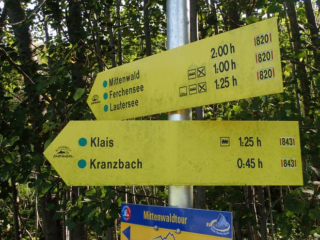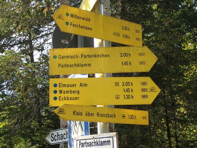 Elmau 9.57 Uhr Zwei Stunden bis Garmisch-Partenkirchen. Ich hatte 118 Minuten benötigt. Allerdings seit "Elmau 1 Stunde" waren nur 22 Minuten vergangen. Aber als Richtungsanzeige waren die Schilder brauchbar (wobei ich aber mit Handy und GPS navigierte). |