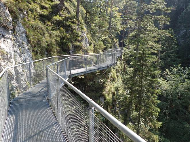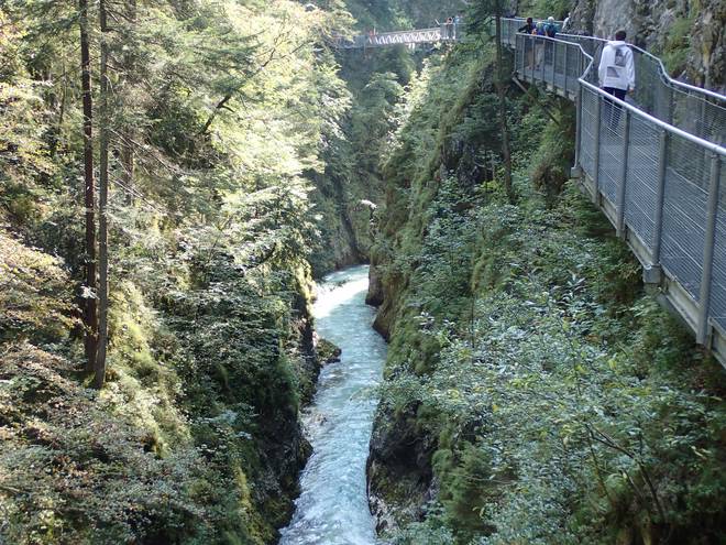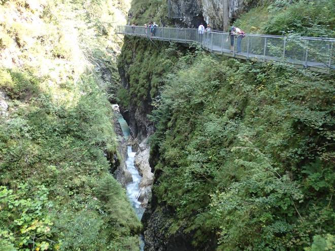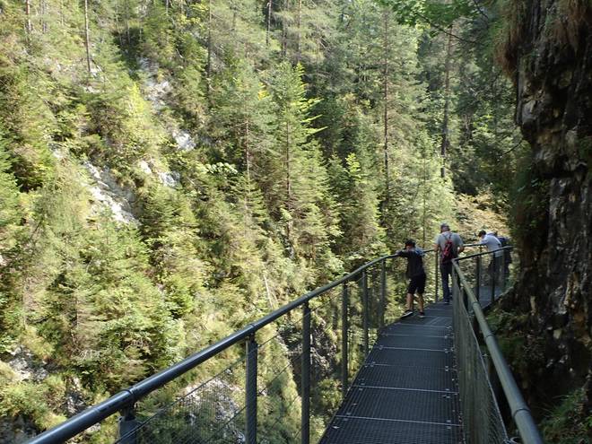 Leutascher Geisterklamm Die Leutascher Geisterklamm und die Leutaschklamm sind zusammen eine Klamm. Seit 2006 gibt es diesen 50 Meter hohen Wanderweg. Diese Bauweise soll angeblich der Höhenangst entgegenwirken, dann hätte man den Boden jedoch nicht durchsichtig gestalten dürfen. |