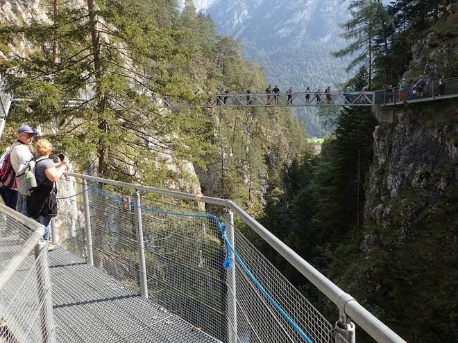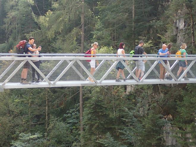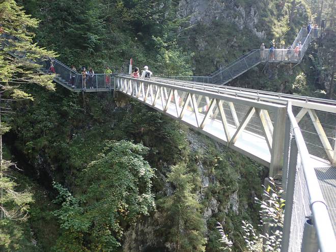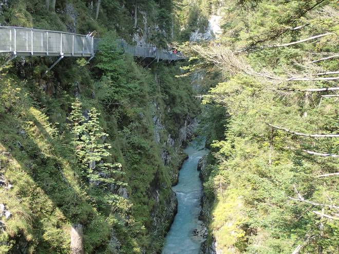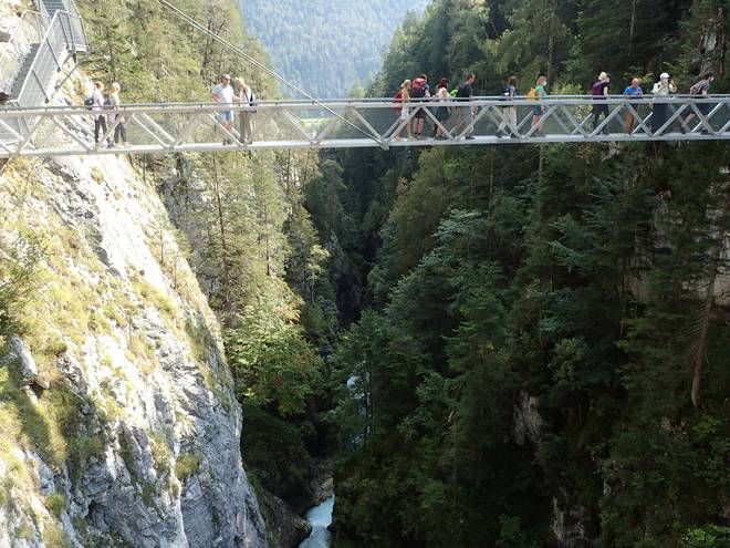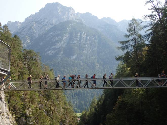 Panoramabrücke Leutascher Geisterklamm Die Konstruktion sah ja noch verwegener aus. Und dann die vielen Menschen. Das Karwendel-Gebirge im Hintergrund werde ich von Mittenwald später noch besser sehen könne. |