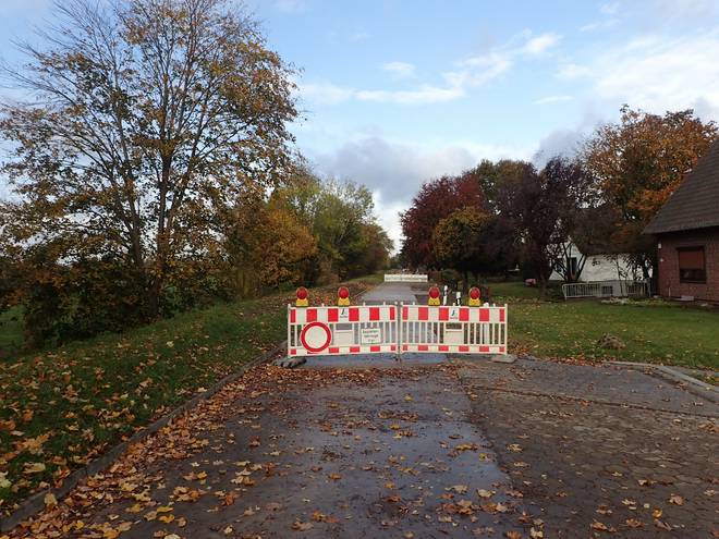 Achterdeich Was für eine dumme Sperrung war das denn? Da wurde nicht einmal ansatzweise gebaut. Es hab auch ein Loch oder sonst etwas. Also drehte ich um und machte mich an die drei Kilometer Umweg, um die 50 gesperrten Meter zu umwandern. Quatsch. Natürlich nicht. Der Deich war ja frei. |