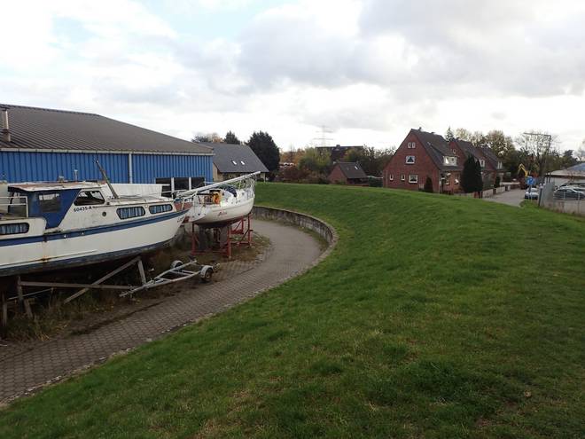 König-Georg-Deich 14.01 Uhr / Km 33,1 Verfluchter Regen. Aber falls nun die Navigation ausfallen sollte, würde ich irgendwie ans Ziel finden. Mit 700 Meter zu viel auf der Uhr wäre es auch nicht schlimm, wenn mein Weg dann zu kurz ausfallen würde. Noch aber wollte ich gerne den geplanten Weg weiterlaufen. Naja... wandern. |