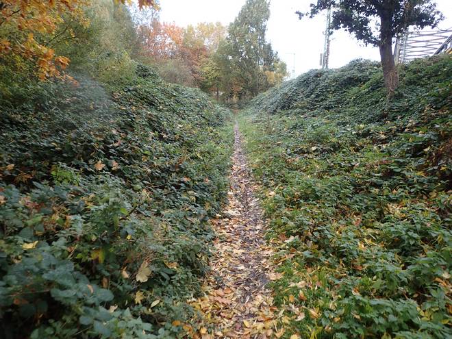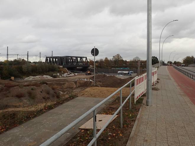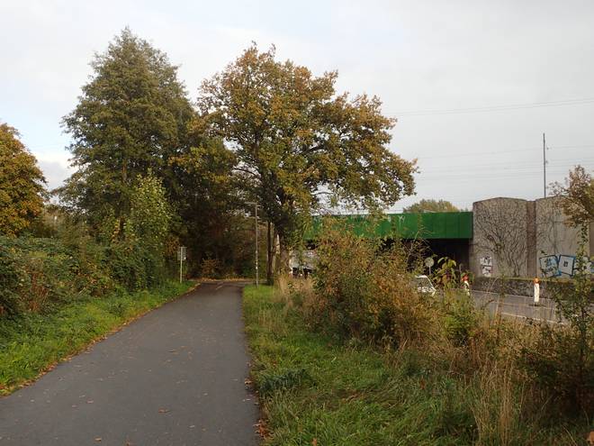 Kükenbracksweg Die alte Trasse der B73 hatte ich jedenfalls erreicht. Die wurde gerade abgerissen. Die neue Trasse läuft 450 Meter weiter östlich. Hätte man das schon vor der Bundesgartenschau geschafft (die war 2013), hätte die Schau nicht in zwei Hälften links und rechts der B73 stattfinden müssen. |