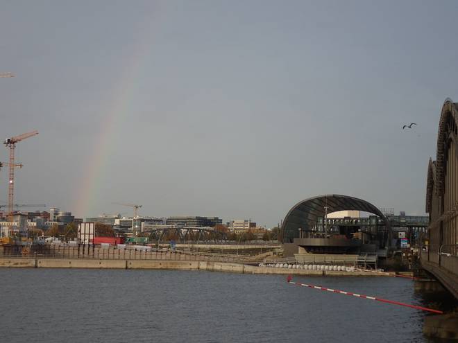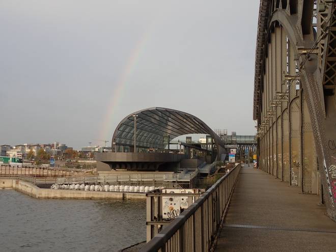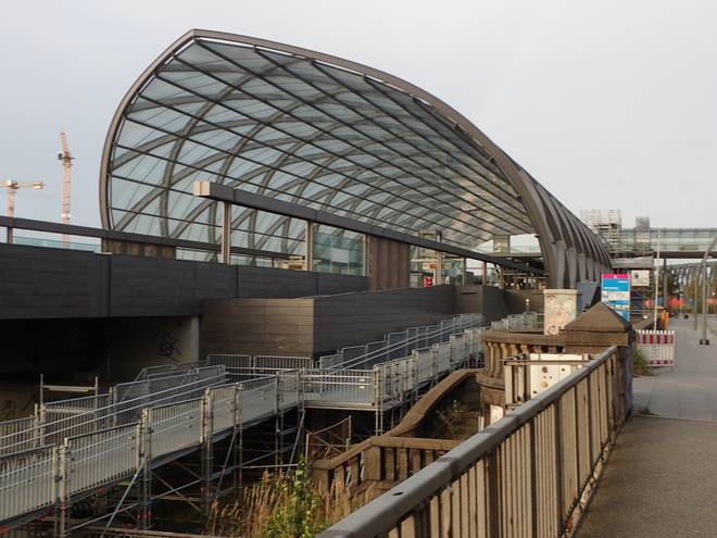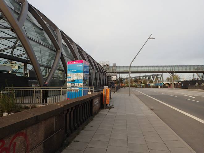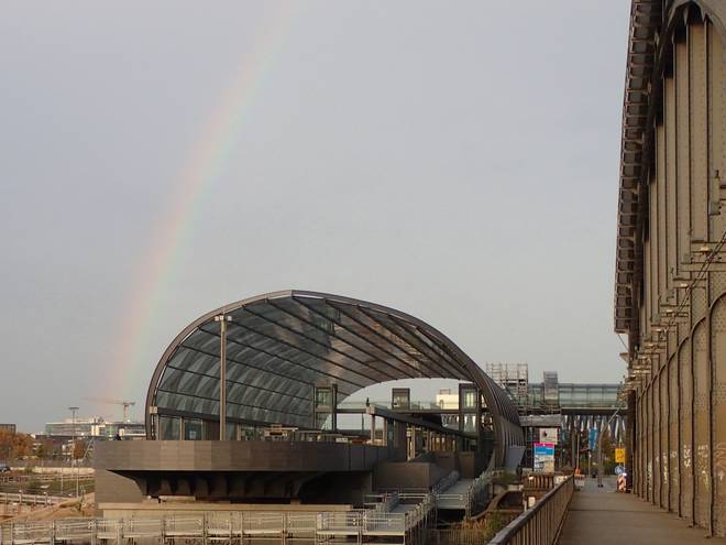 Mein Ziel lag am U-Bahnhof Elbbrücken, das Gebäude mit dem runden Dach gleich links neben der Freihafenelbbrücke. |