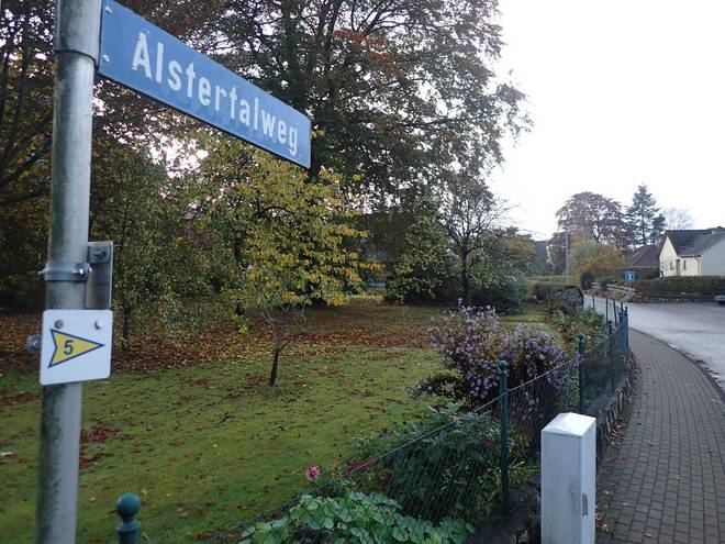 Alsterquelle Henstedt-Ulzburg 7.42 Uhr / Km 0,01 Zu "New York, New York" (Frank Sinatra, wer sonst) lief ich dann los. Die ersten paar Meter folgte ich der Alster. Bis zur Brücke da vor. Die war zwar nicht so groß wie die Verrazzano-Narrows-Bridge, aber okay. |