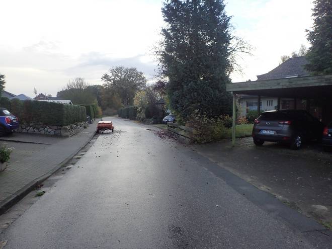 Wilstedter Straße Das Kamikaze-Ding ohne Fußweg und Fahrbahn-Rand. |