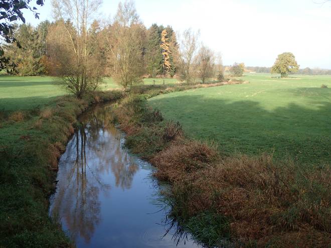 Oberalsterniederung Hohnerberg Nun wie sie immerhin schon deutlich als Fluß erkennbar. Oder noch eher Bach. Nach Definition soll ein Fluß eine Breite von mindestens drei Metern haben. |