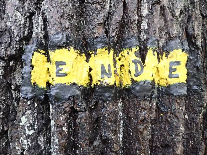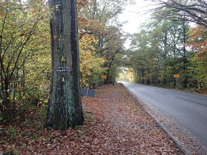 Segeberger Straße (B 432) Kayhude Die Rückseite des Baumes markiert das Ende für die Gegenseite. Allerdings waren die ersten Meter des Alsterwanderweges gerade gesperrt. |