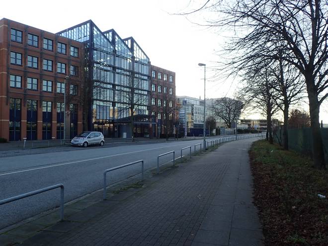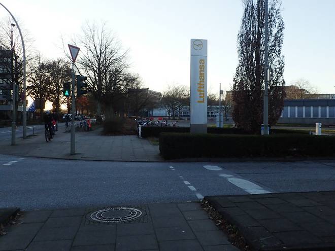 Flughafenstraße Inzwischen hatte ich nur noch 800 Meter zu viel auf meiner Uhr. Ein paar Meter hatte ich an der Tarpenbek gespart. Aber nicht ansatzweise genug. Und verlaufen oder abgekürzt hatte ich nicht. |