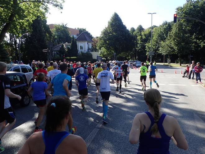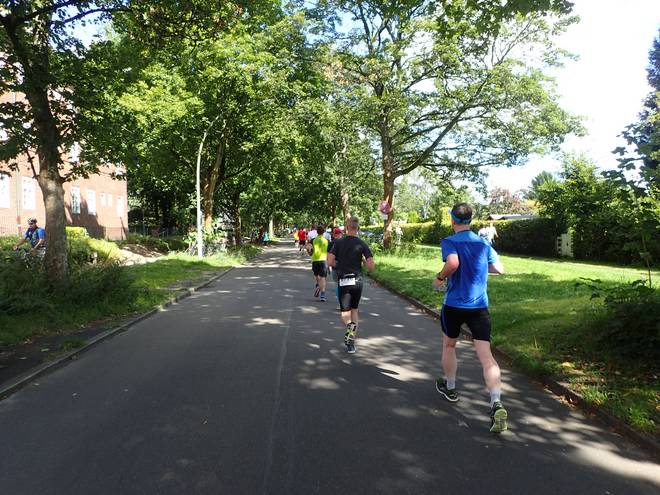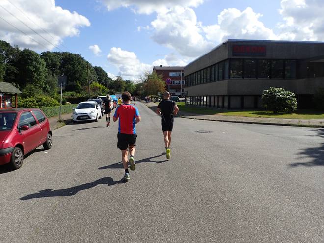 Krohnstieg 11.39 Uhr / Km 8,3 Ich hatte das Tempo noch ein wenig angezogen, war nun so bei 4:42 Min/Km unterwegs. |