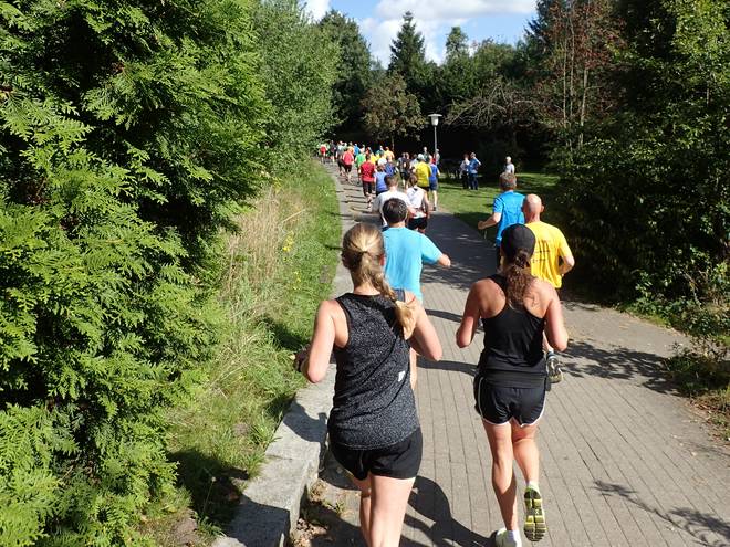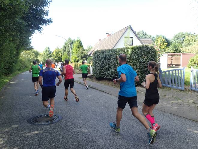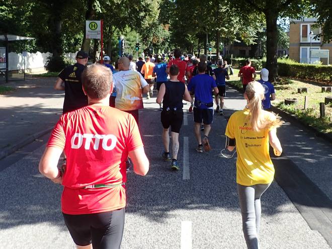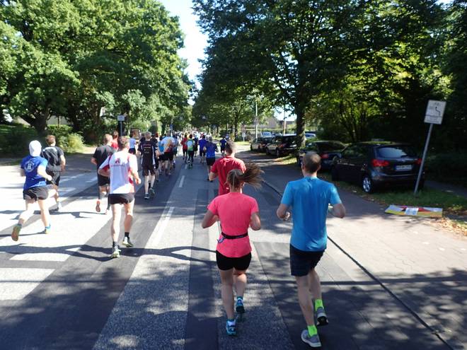 Weg beim Jäger 11.07 Uhr / Km 1,3 Ich lief zunächst einmal mit 5:00 Min/Km los, wollte unter 1:20 Stunden ins Ziel kommen. |
