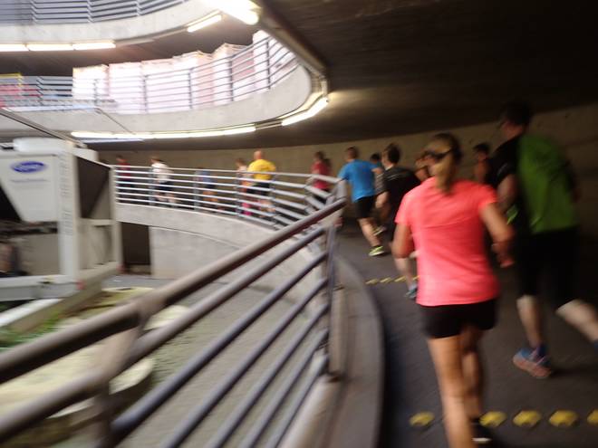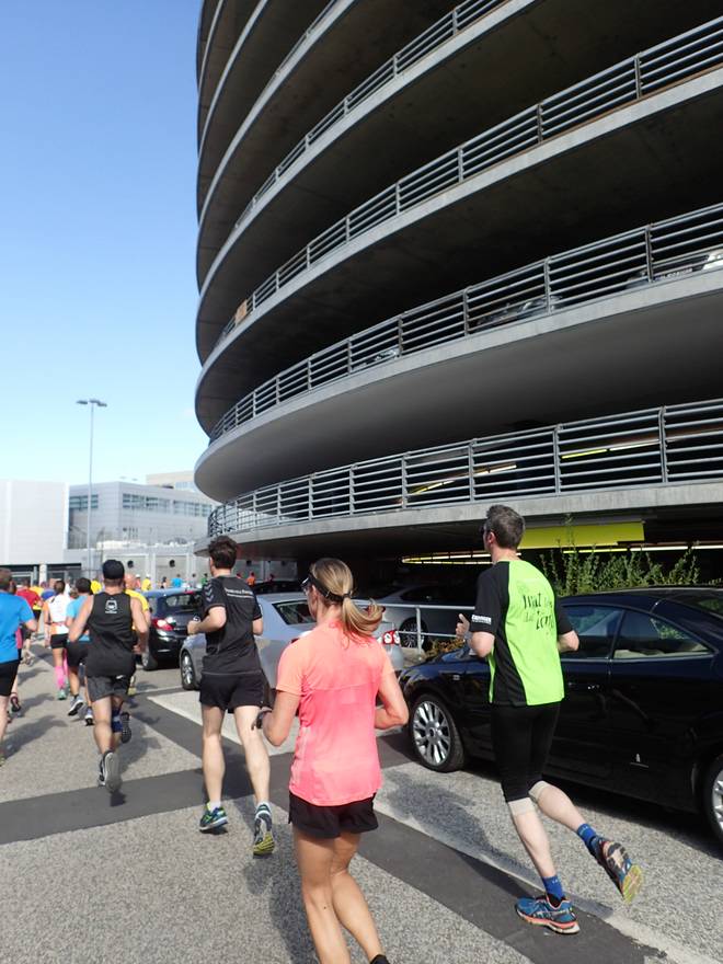 Parkhaus P5 Terminal Hamburg Airport 11.21 Uhr / Km 4,2 Einige, aber sehr leichte, holt man sich auf einer Runde im Kreisel des Parkhaus P5 ab. Das läuft sich gut rauf. Ob man da auch trainieren darf? |