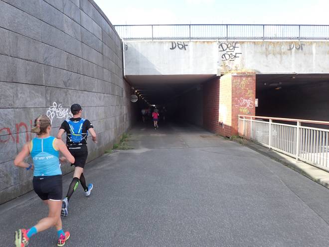 Krohnstiegtunnel 11.41 Uhr / Km 8,7 400 Meter ist der Tunnel unter dem Rollfeld lang. Ein ziemliche lauter Tunnel. Der Krach der Autos hinter der Wand da rechts tönt rüber, als gäbe es keine Wand und dann könnte einem auch noch die Flugzeuge über den Kopf rollen. |