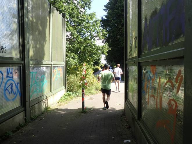 Bayernweg 11.44 Uhr / Km 9,3 Tunnel durch, Steigung rauf und durch die Lärm-Schutzwand durch. Dem Tempo schadete es nicht. |