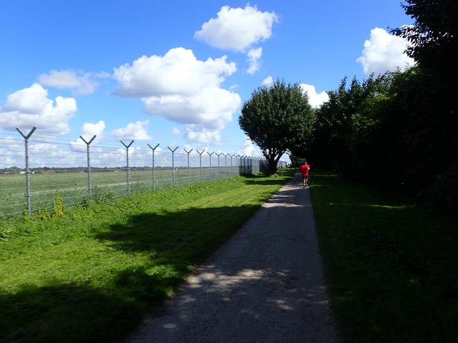 Flughafenwanderweg 11.27 Uhr / Km 5,6 Hier ist einer der Punkte, wo man die Chance hat, Flugzeuge mal direkt von unten zu sehen. Leider startete oder landete hier gerade keines. |