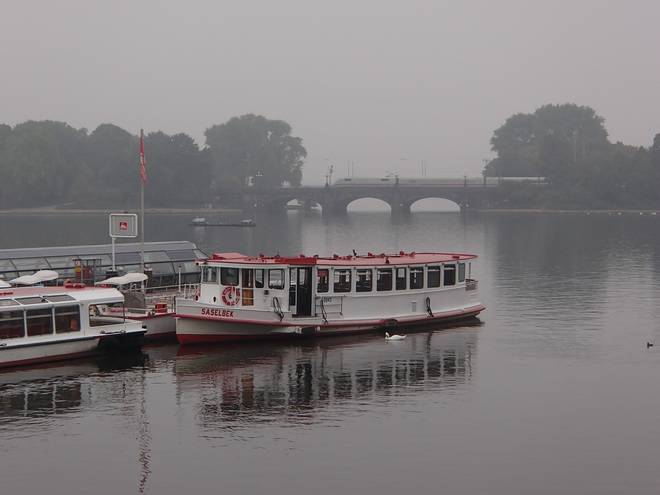 die Fontenay zum Mittelweg hinaufgeprügelt. Den Kilometer 8 beendete ich nach 4:05 Minuten. Jetzt stand die Uhr bei 31:40 Minuten. Das sah so was von gut aus. Aber noch waren es zwei nicht gerade einfache Kilometer. Und mir tat längst alles weh. Positiv dabei: die Schmerzen im linken Bein fielen dabei nicht mehr auf. Dann ging es die Alsterterrassen hinunter, die Kennedybrücke rauf und dann wieder runter zur tiefen Bahnunterführung am Ferdinandtor. Auf der Außenalsterrunde mag man diese Steigungen ja nicht so spüren, aber beim Alsterlauf sind sie einfach nur brutal Kilometer 9 in eigentlich schon sensationellen 3:59 Minuten. Mit 35:39 Minuten auf der Uhr ging es auf die letzten 1000 Meter. Foto: |