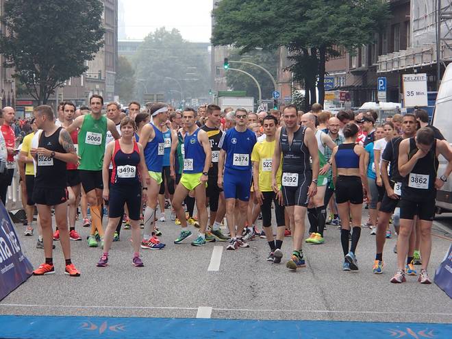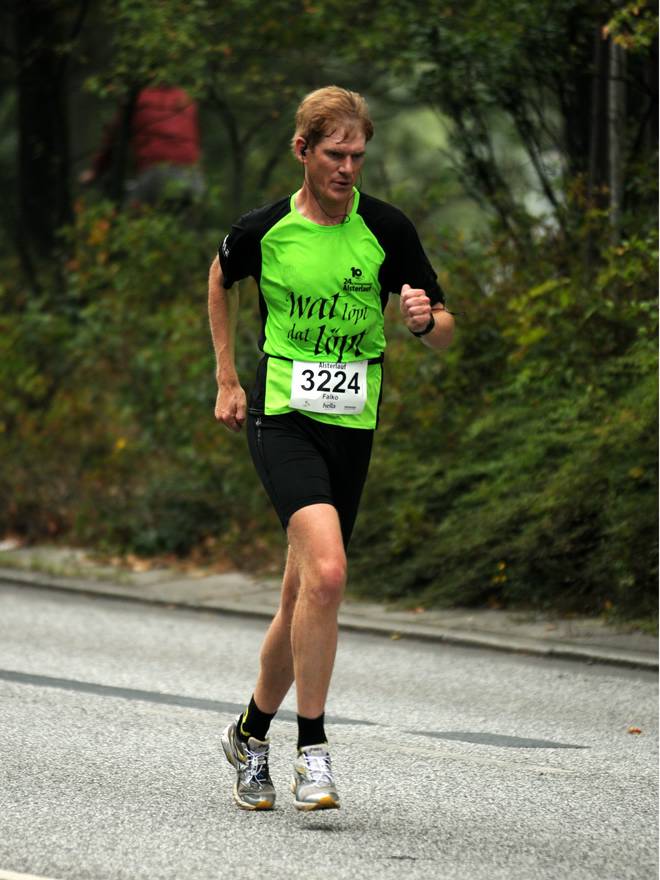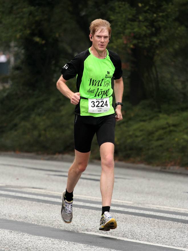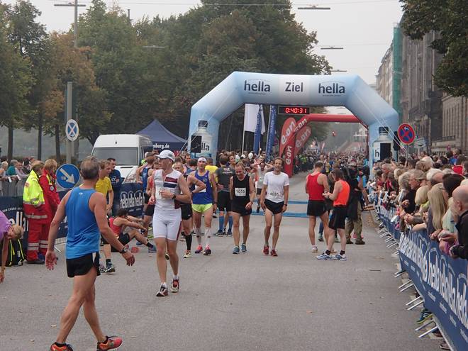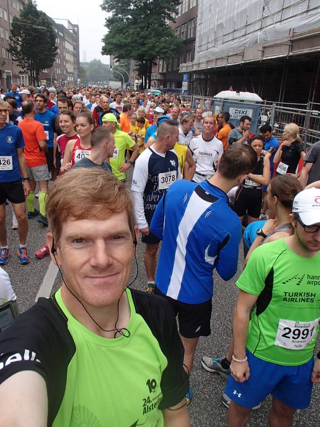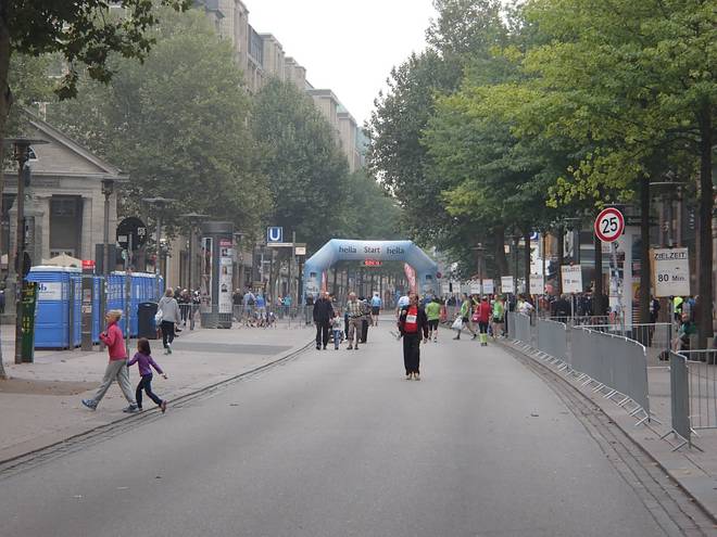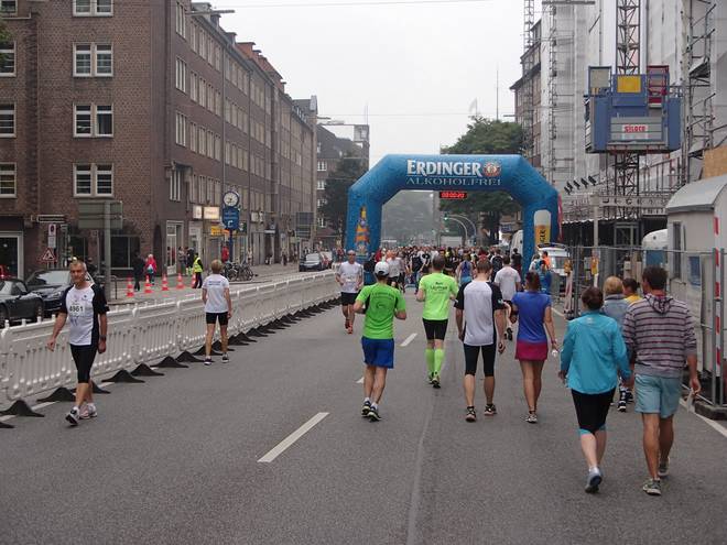 Minuten. 11:40 Minuten auf der Uhr. Nun ging es die Außenalster im Osten entlang. Die Strecke ist mit im Grunde vom Training sehr bekannt. Allerdings laufe ich da nicht auf der Straße. Es folgten Kilometer 4 in 3:56 und Kilometer 5 in 3:57 Minuten. Es wurde also langsamer. Auf den Kilometern gab es aber auch zwei Brücken mit Steigungen zu meistern. Die Hälfte der Strecke hatte ich in 19:33 Minuten geschafft. Das war persönliche Fünf-Kilometer-Bestzeit und vor allem war es 12 Sekunden schneller als 2013. Foto: |
