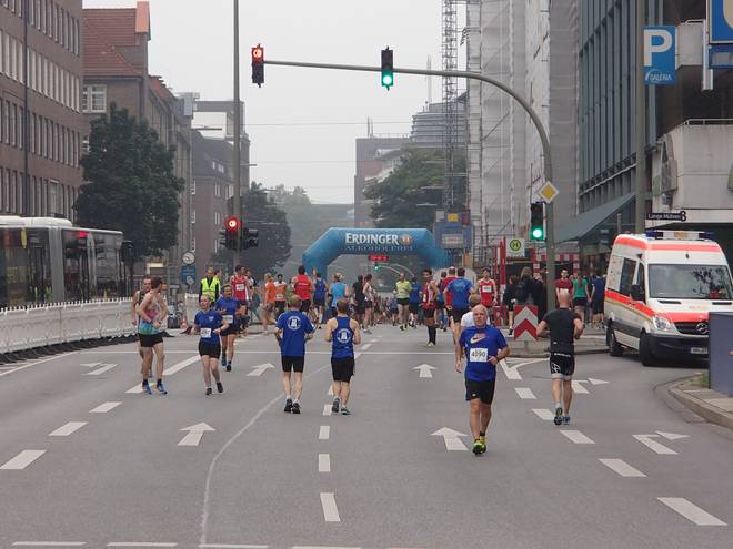 lang... lang... lang... Mit drei anderen Läufern machte ich nun Tempo und wir kamen ganz gut nach vorne. Kilometer 6 in 4:03 Minuten. Kilometer 7 in 3:59 Minuten. 27:35 Minuten zur Kreuzung die Fontenay hoch. Diese Steigung ließ dann das Tempo einbrechen. Aber das war bekannt. Und so schlimm konnte es nicht gewesen sein, dann meine drei Mitläufer vom Harvestehuder Weg hatte ich schnell und weit abgehängt. Foto: |